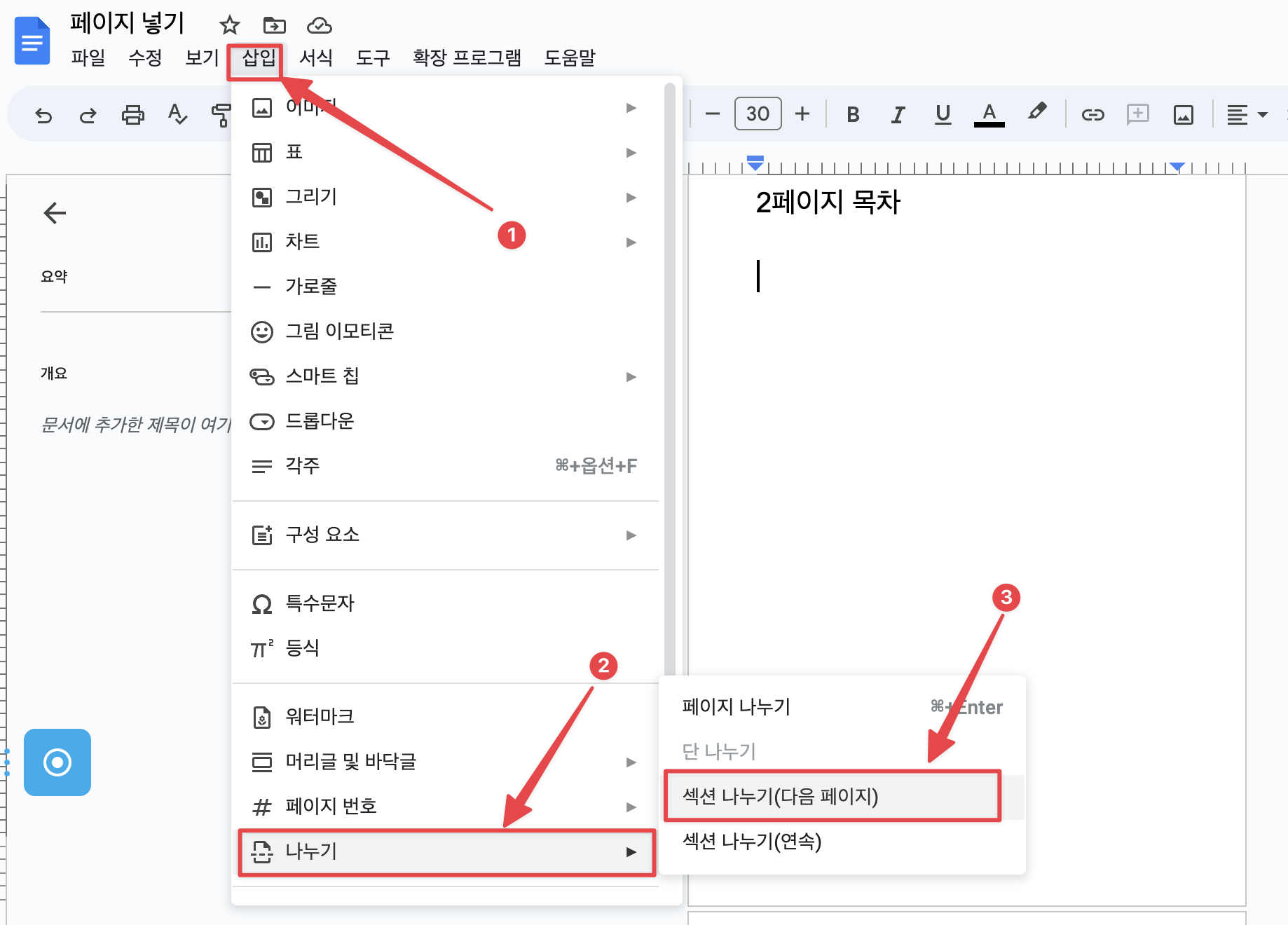 구글문서 목차 페이지 넣는 법 - 원하는 곳부터 1페이지 설정