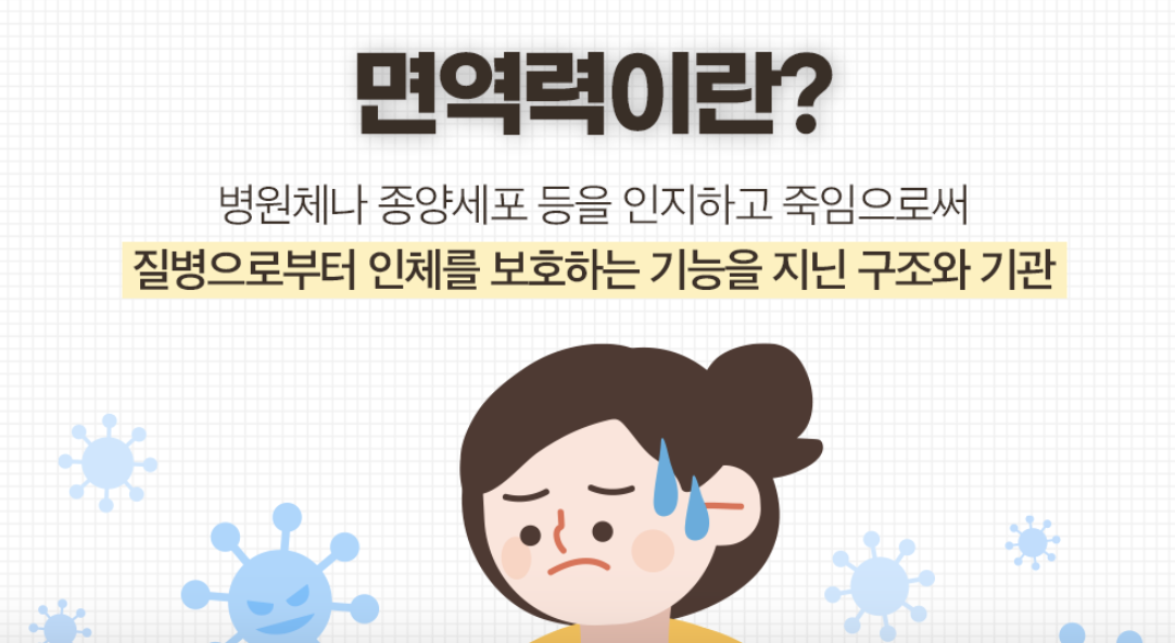 면역력이란 병원체나 종양세포 등을 인지하고 죽이는 능력입니다. 나쁜 것들을 없애는 것이니 질병으로부터 인체를 보호하는 능력이라고 볼 수 있습니다.