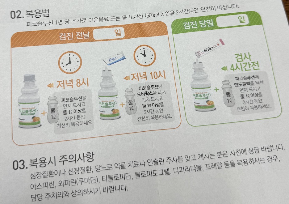 생각보다 간편해졌네요. 복용법 하루 전과 검사 당일로 나누어져 있습니다.
