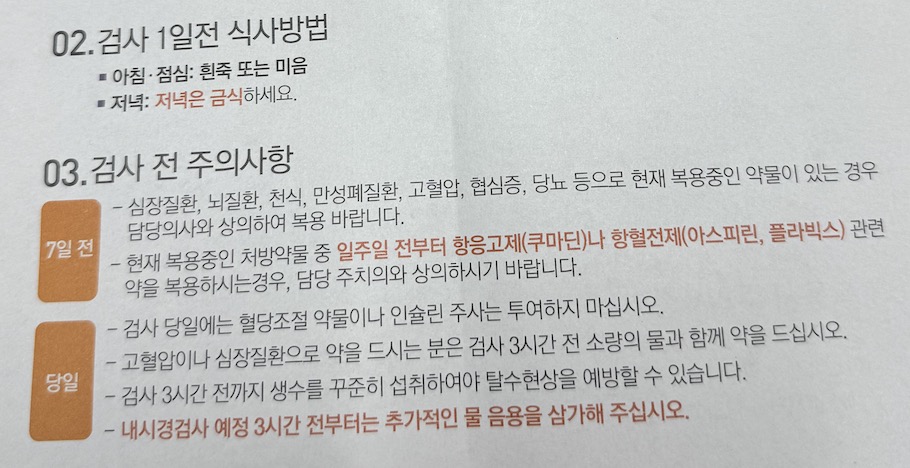 생각보다 간편해졌네요. 복용법 하루 전과 검사 당일로 나누어져 있습니다.