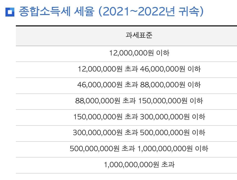 - 과세표준 500,000,000원 초과 ~ 1,000,000,000원 이하 : 세율 42%