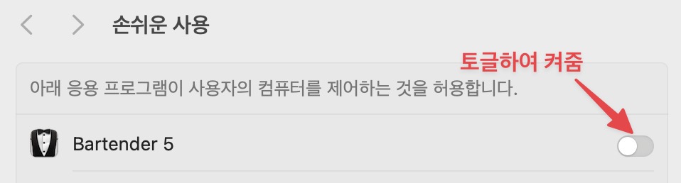 최초 실행하면 맥 설정에서 권한을 허용해주어야 한다. 맨 위의 Open macOS Accessiblility Settings를 클릭하여 아래와 같이 토글하여 켜준다.