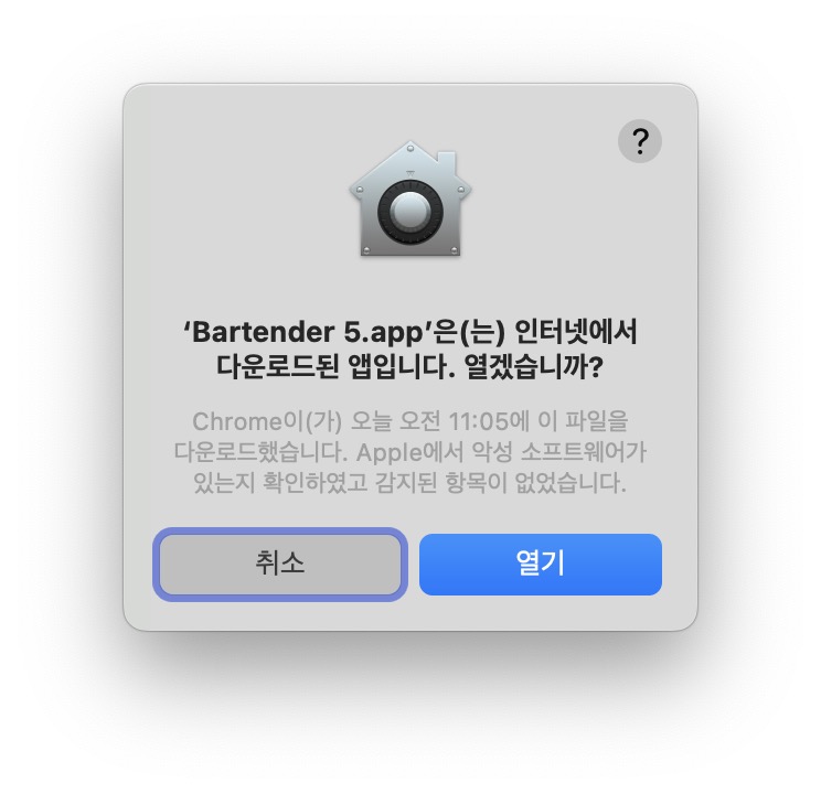 맥 앱스토어에서 다운로드 받은다운로드한 것이 아니라 홈페이지를 통해 다운로드한 dmg 파일을 최초 실행할 때 나오는 메시지이다. 인터넷에서 다운로드되었다는 사실을 한번 더 알려주고 사용자가 열기를 누르면 실행된다.
