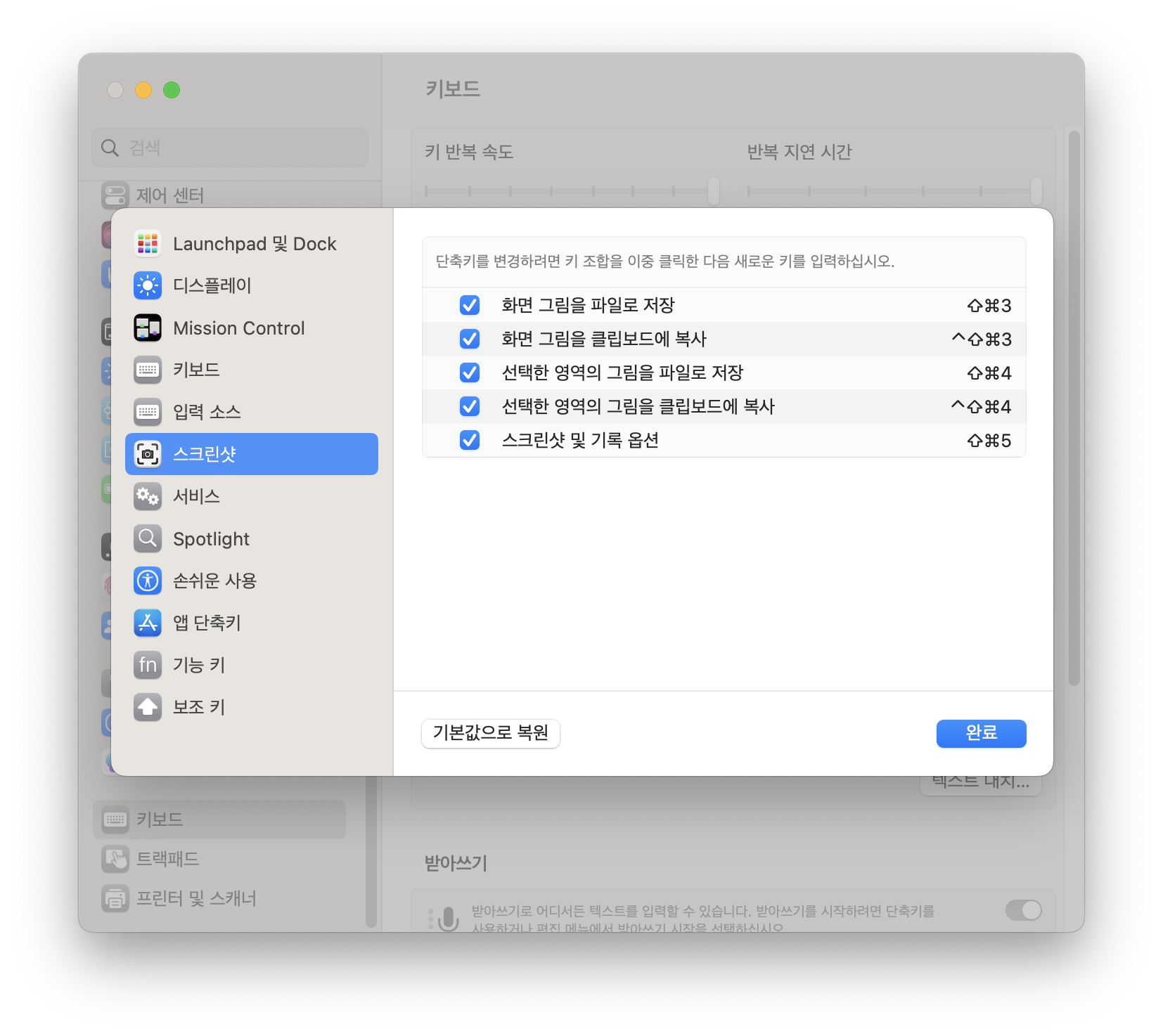 기존 맥의 화면 캡처 단축키를 동일하게 이용합니다.