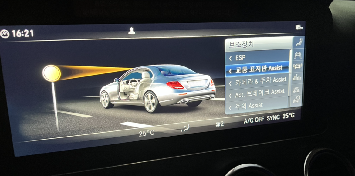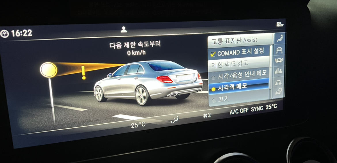 벤츠는 교통표지판을 통해 최대 속도 이상으로 달릴 경우 경고음이 나도록 설정이 된 경우가 있습니다.
