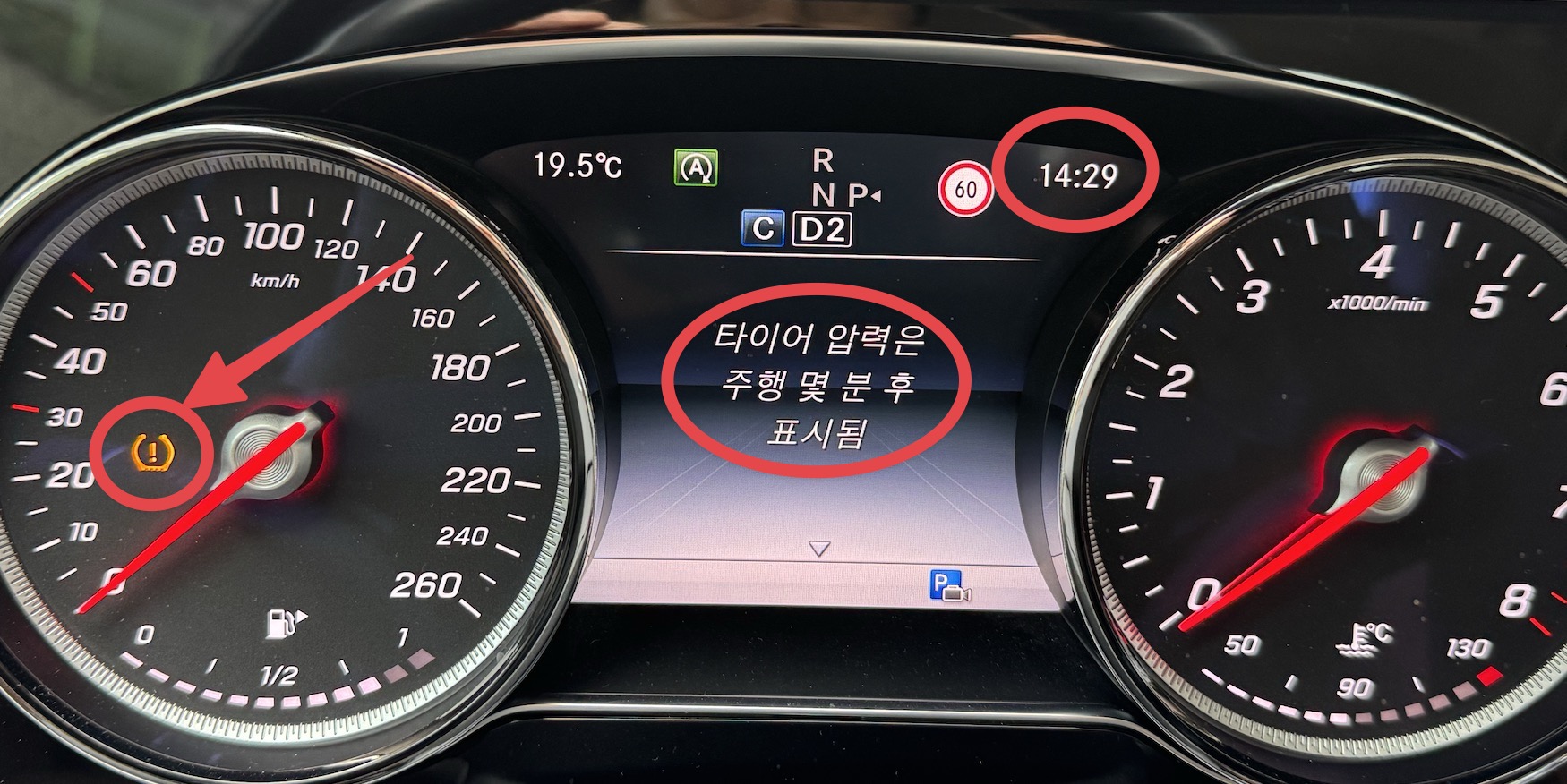 타이어 압력은 주행 몇 분 후 표시된다고 표현됩니다. 시동 건 시간은 14:29분 이었습니다.