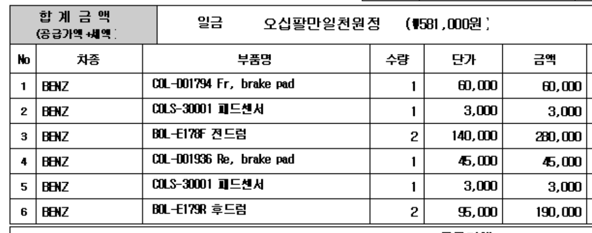 위의 부품 주문 금액 총액은 481,000원입니다. 여기에 공임 24만원 정도 포함하면 총 72만 원가량 되겠네요.
