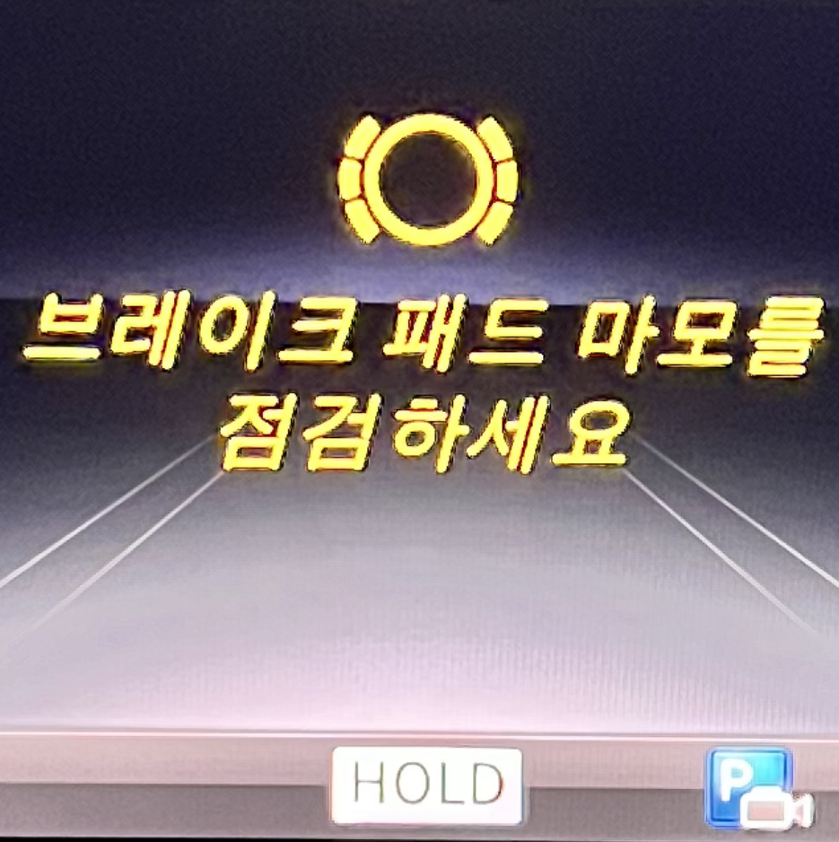 벤츠 w213 모델입니다. 위에서 보면 라이닝 디스크 면에 직접 붙어 있는 부분 보이시나요? 직접 맞닿은 부분이 좀 더 진한 색을 보이는데, 진한 색 부분의 두께가 얼마 남지 않은 것을 볼 수 있습니다. 이 정도 두께에서 위와 같이 브레이크패드 경고등이 점등됩니다.
