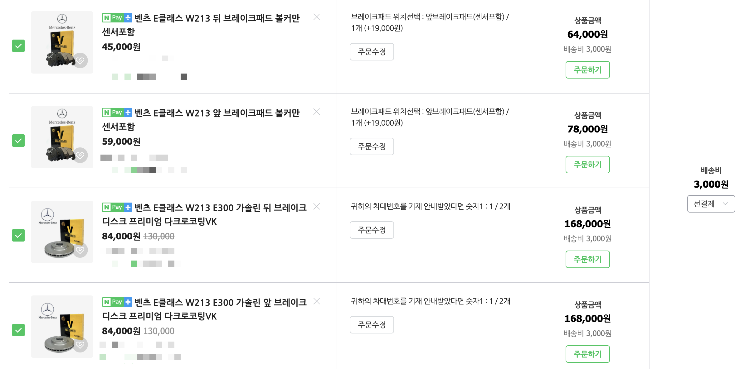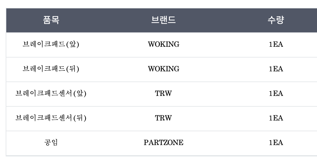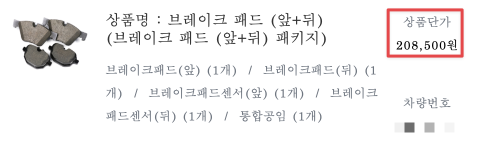 해당 링크에서 패드 앞 1개, 패드 뒤 1개, 디스크 앞 2개, 디스크 뒤 2개 이렇게 확인하여도 담기를 했더니 아래와 같았습니다.
