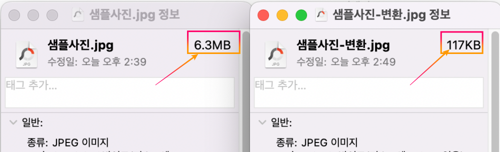 그렇게 해서 나온 변환 파일과의 크기를 비교하면 아래와 같습니다.