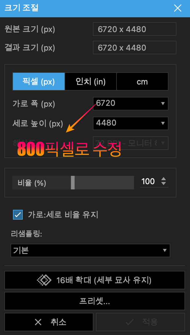 위에서는 가로를 800픽셀로 했지만 조금 더 고화질을 원한다면 1000픽셀로 설정해도 됩니다.