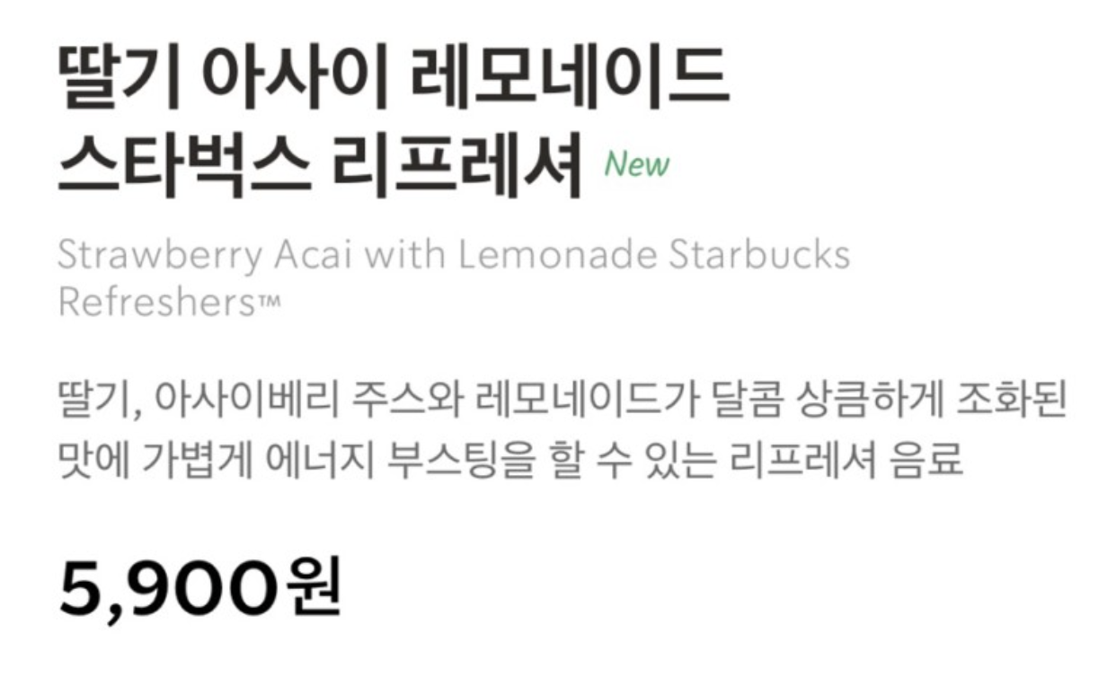 위의 딸기 아사이 레모네이드 리프레셔의 경우 가격이 톨 사이즈 기준 5,900원입니다.