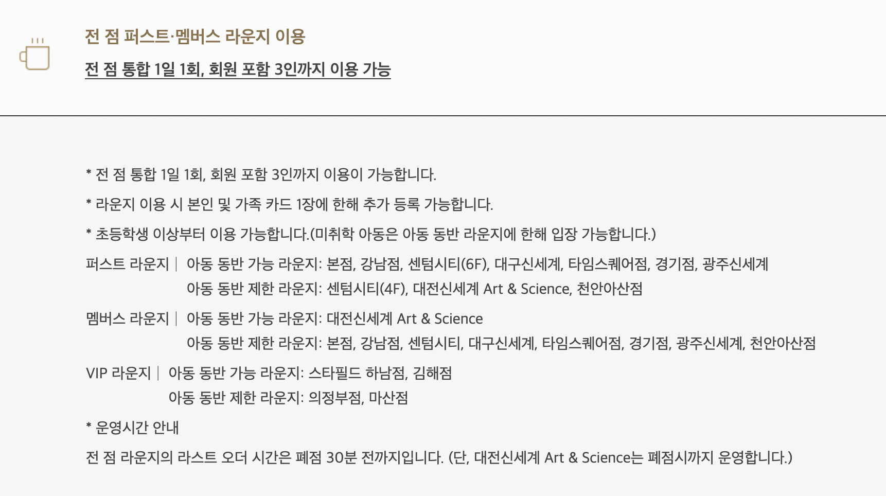 - 퍼스트 프라임라운지 : 대전점에만 있음(다이아몬드 회원용)