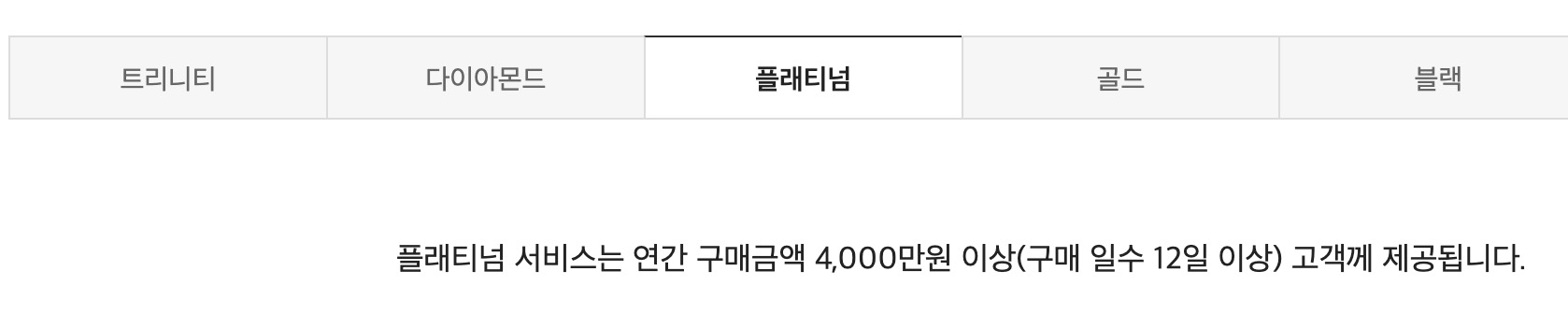 백화점은 구매 금액에 따라 고객의 등급을 나누어 서비스를 제공한다. 트리니티 등급이 가장 높은 등급이고, 다이아몬드, 플래티넘, 골드, 블랙, 레드 등급으로 나뉘어 있다. 여기서 플래티넘 등