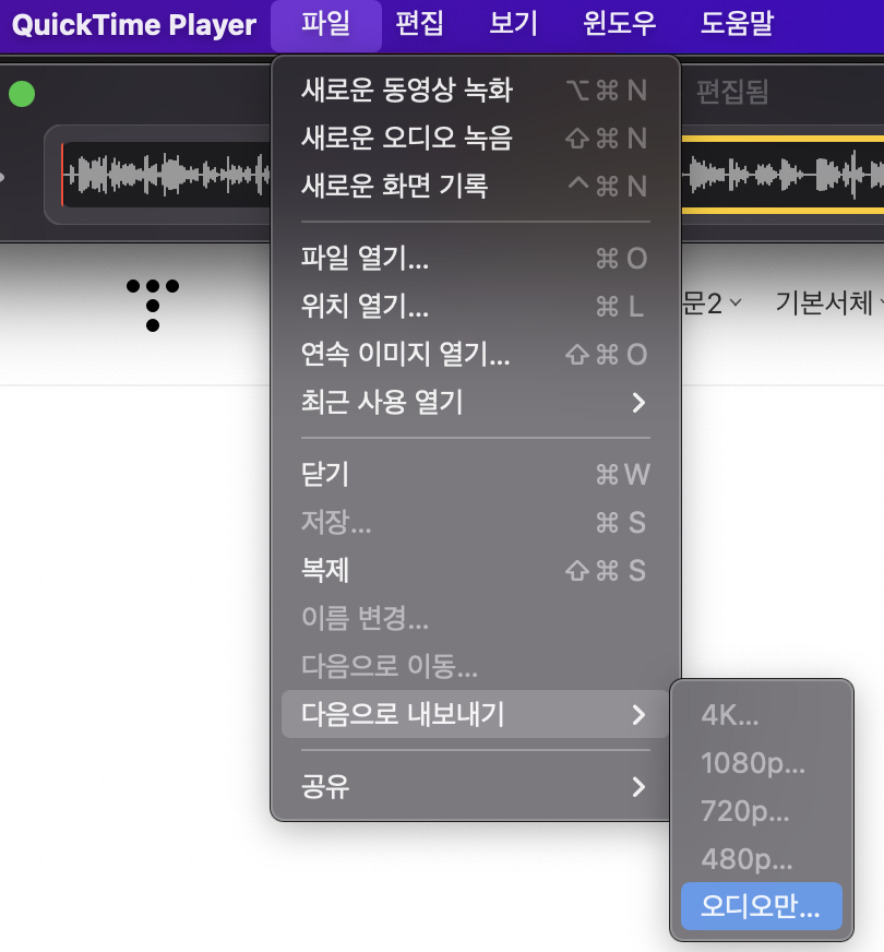 가장 앞에 둘 음성 메모 파일을 퀵타임 플레이어로 엽니다.