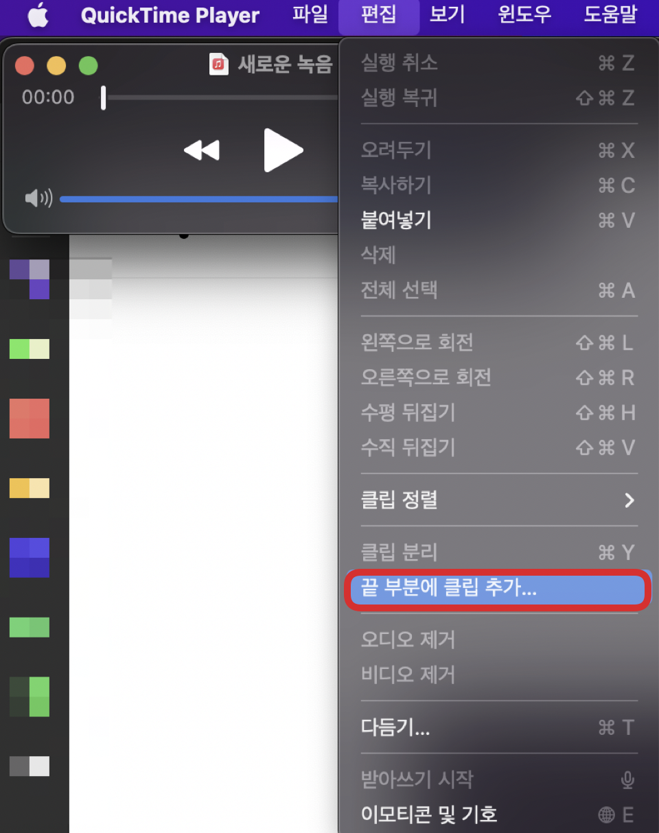 그리고 편집 메뉴에서 아래와 같이 <끝 부분에 클립 추가...>를 클릭하여 파일을 추가합니다.