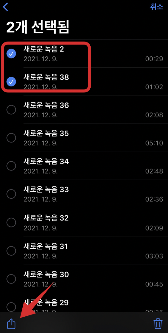 에어드롭으로 옮기는 방법은 아래와 같이 원하는 음성 메모를 선택한 후에 아래 공유 버튼(화살표 가리키는 곳)을 클릭하여 맥북으로 옮기는 것이 가장 간단합니다.