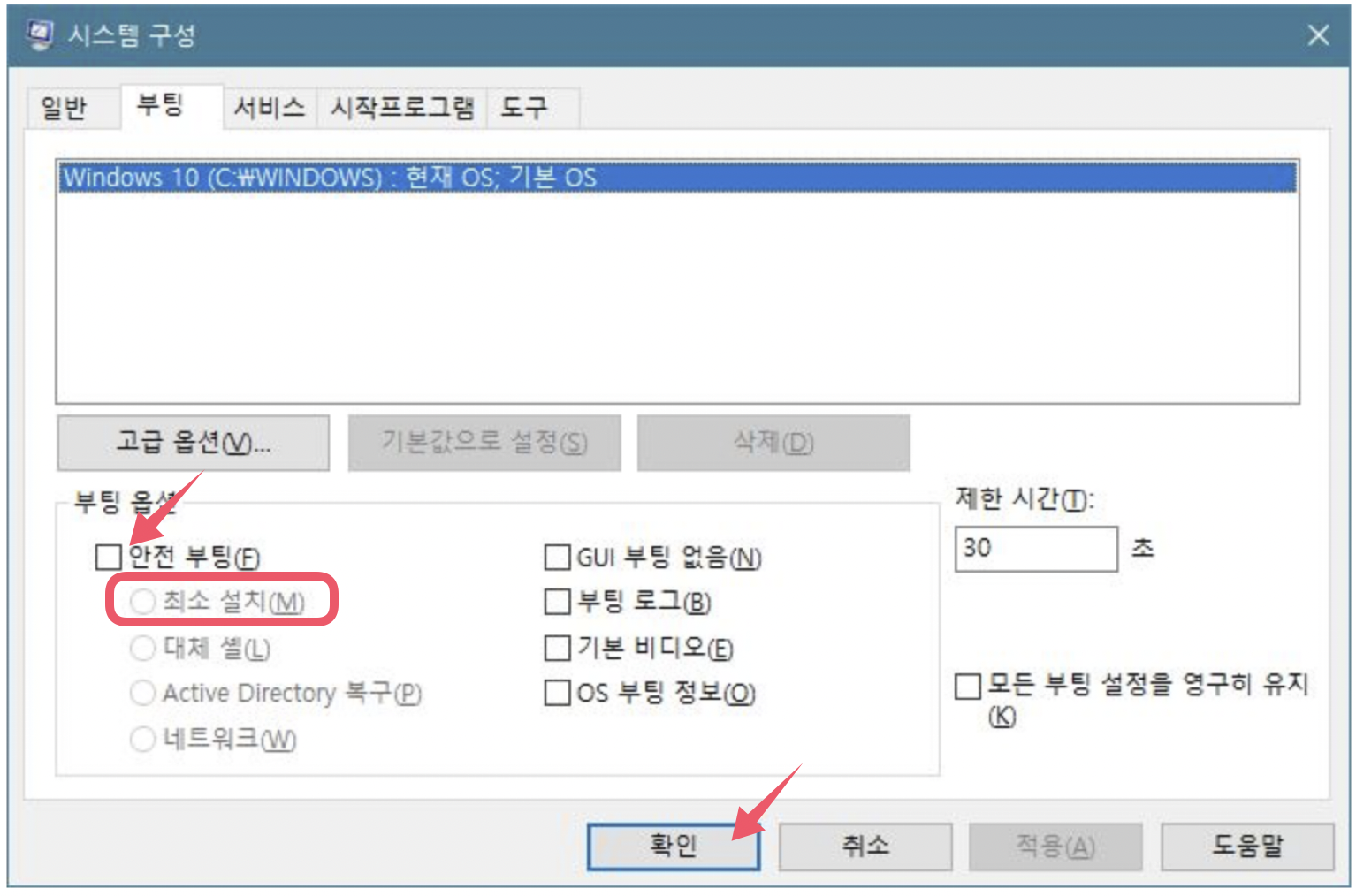 시스템 구성화면에서 부팅을 클릭한 후 아래의 안전모드를 체크합니다.