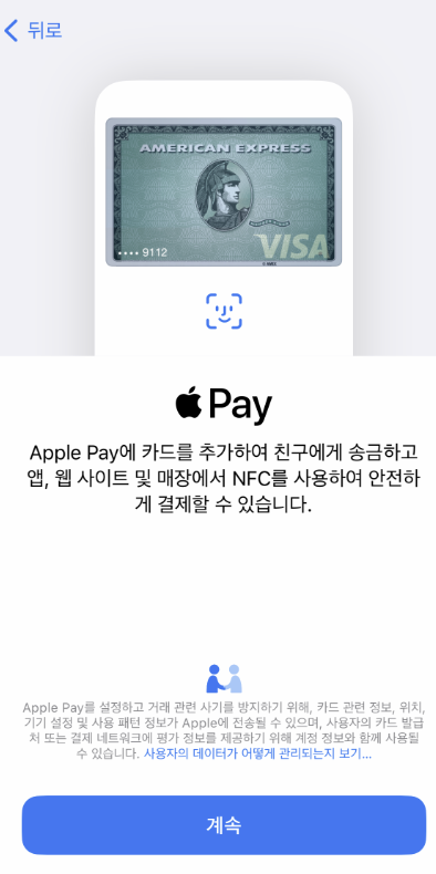 애플페이를 설정하려면 신용카드나 체크카드를 등록해야 합니다.