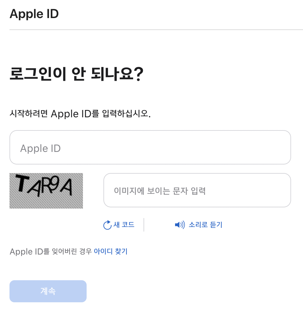위에서 자신의 애플아이디와 캡챠 코드를 넣고 계속 버튼을 누르면