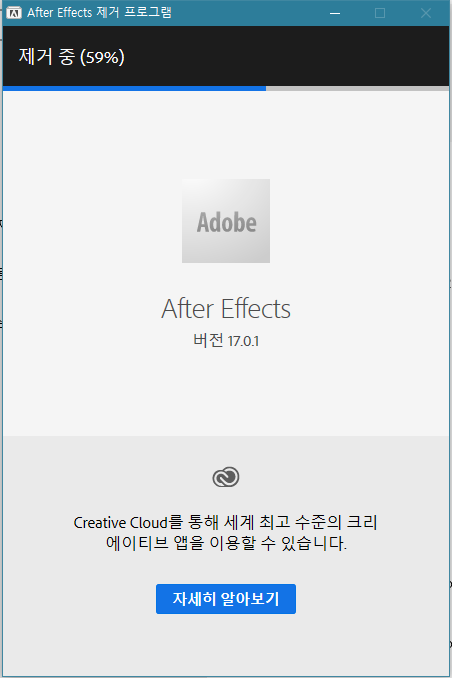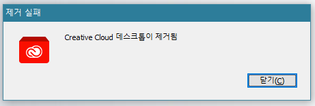 그런데 위의 메시지가 좀 이상하게 보이지 않나요? 창에는 "Creative Cloud 데스크톱이 제거됨"이라고 나와있는데 윈도 창의 타이틀에서는 "제거 실패"라고 뜹니다. 한글화 작업에 오류가 있는데 아직까지 고쳐지지가 않았군요.