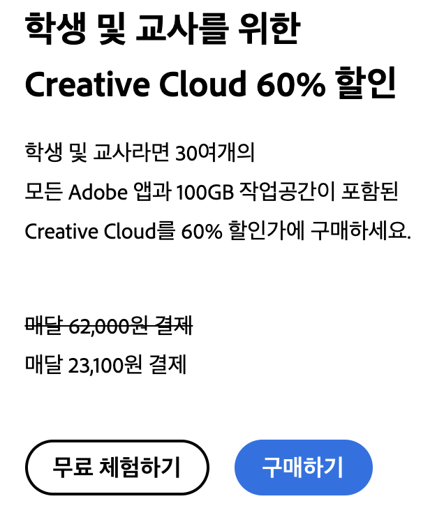 학생과 교사는 60% 이상 할인된 가격으로 Adobe Creative Cloud를 구매하여 Photoshop, Illustrator, InDesign, Premiere Pro 등을 이용할 수 있습니다.