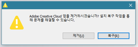 프로그램을 삭제할 경우에는 윈도우 제어판에서 프로그램 추가/삭제를 통해 삭제를 하는 것이 깔끔합니다. 그런데 Adobe Creative Cloud를 선택하여 삭제 버튼을 누르면 아래와 같은 메시지 때문에 삭제가 되지 않는 경우가 많습니다.