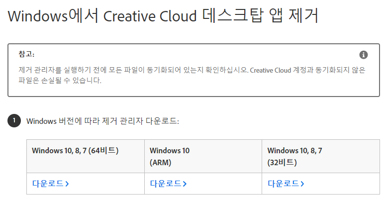 바로 어도비 홈페이지에서 언인스톨러를 다운로드 받아서 처리할 수 있습니다. 반드시 공식 홈페이지에 접속해서 받는 것이 중요합니다. 어도비 홈페이지에서 Creative Cloud 삭제로 검색해서 자신에게 맞는 버전을 다운로드합니다.