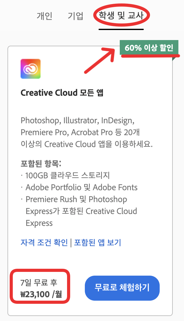 만약 학생이나 교사라면 무조건 이 플랜으로 해야 합니다. 정말 저렴한데, 어도비의 모든 제품을 모두 사용할 수 있기 때문에 이익이 큰 편입니다. 저 플랜에는 모바일로 사용할 수 있는 앱들도 포함되더군요.