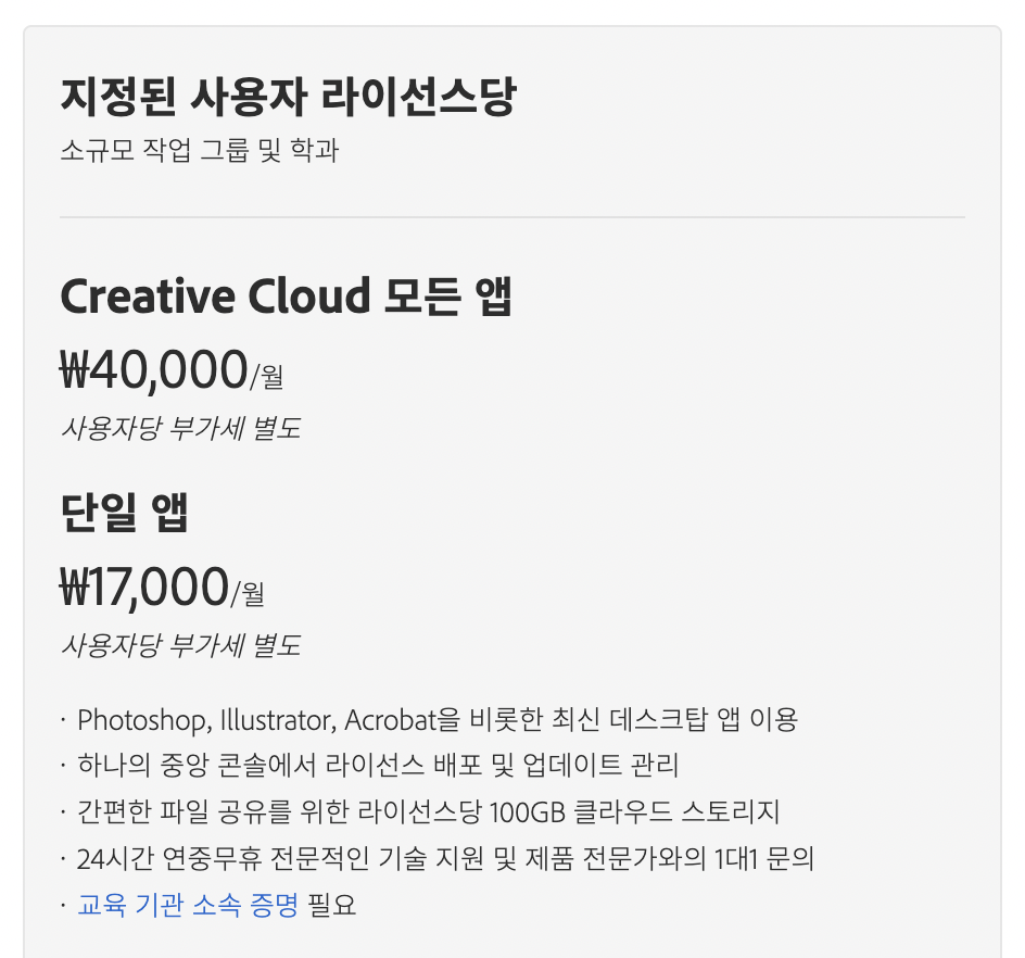 어도비 공식 홈페이지에 확인해보니 위의 가격은 소규모 그룹, 학과, 강의실, 실습실 또는 교육 기관 전체를 위한 가격정책으로 Photoshop, Illustrator, Acrobat 등 최신 Creative Cloud 앱을 이용할 수 있다고 합니다. 그리고 하나의 중앙 콘솔에서 라이선스 배포 및 업데이트를 관리할 수 있다고 하니 최신 프로그램으로 항상 사용할 수 있는 것으로 보입니다.