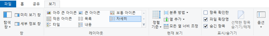 위와 같이 보기탭에서 자세히, 그리고 파일확장명, 숨긴항목에 체크를 해두면 숨겨진 파일 없이 파일 정보를 일목요연하게 확장자와 함께 볼 수 있습니다.