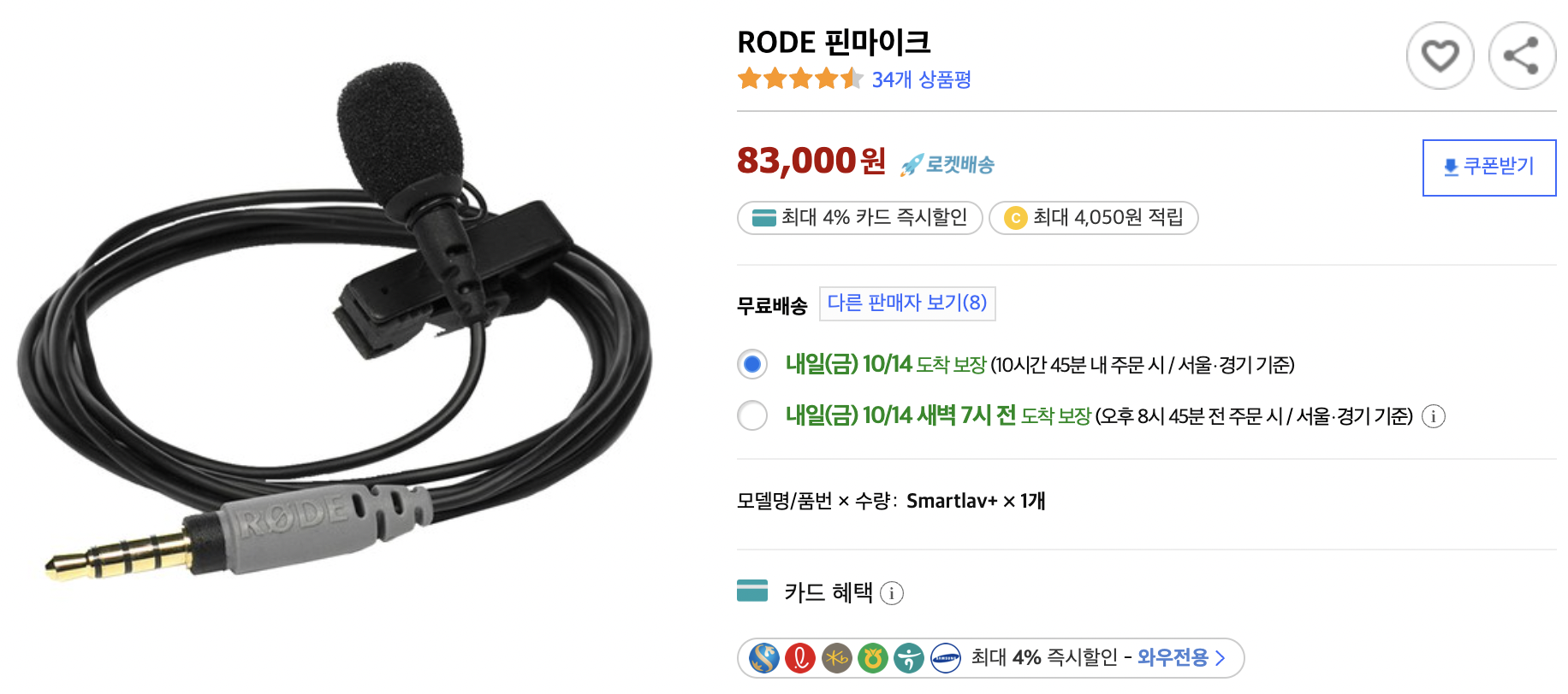 로드 Rode 핀마이크와 같은 것들은 조금 비싼 편이기는 한데 3~4만 원대 핀 마이크 사서 맘에 안 들어서 결국 다시 사게 되는 것을 고려하면 한번 살 때 이것들을 이용하면 좋습니다.