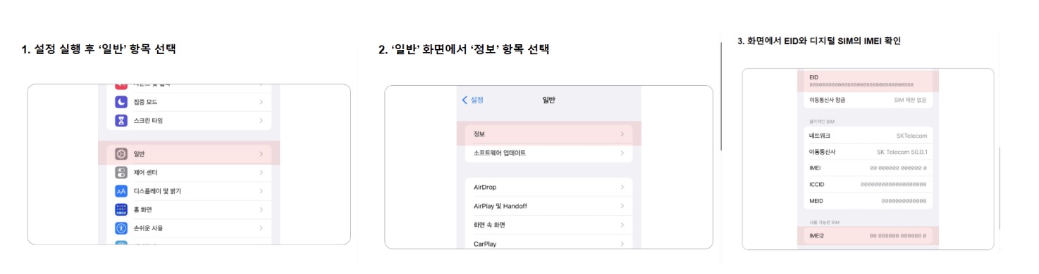 EID 및 IMEI 준비: eSIM 개통을 위해 휴대폰의 EID(전자식별번호)와 IMEI(기기식별번호)가 필요합니다.