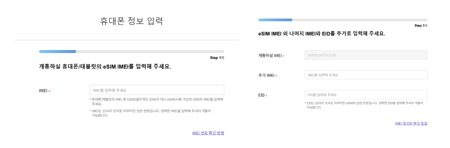 EID와 IMEI를 입력하세요. 반드시 현재 개통하려는 기기의 정보를 입력해야 하며, 기존 기기의 IMEI를 입력하면 개통이 실패할 수 있습니다.
