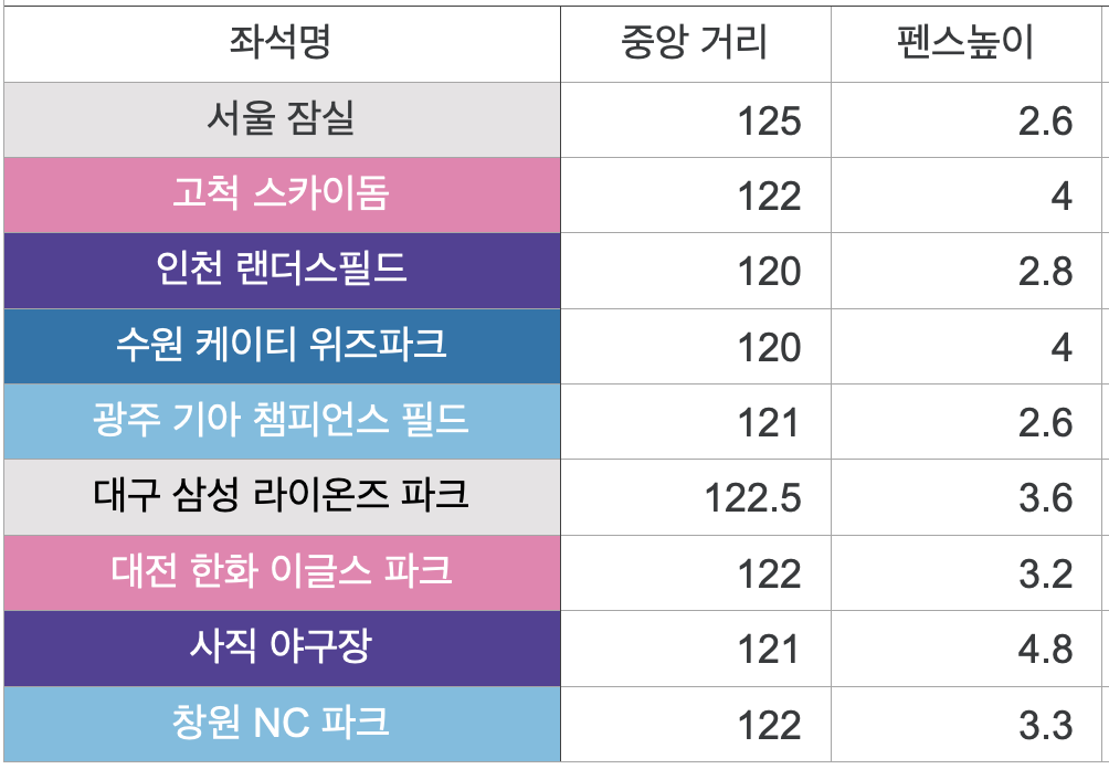 우리나라 야구장 홈런에 큰 영향을 주는 중앙거리와 펜스 높이는 아래와 같다.