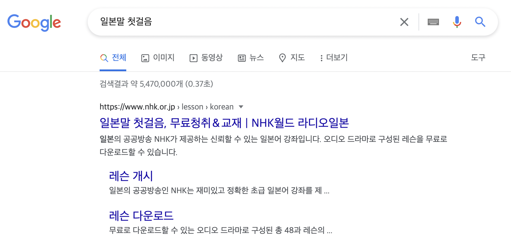 일본말 첫걸음으로 구글 검색을 하면 위와 같이 <NHK 월드 라디오 일본>이 최 상단에 뜬다.