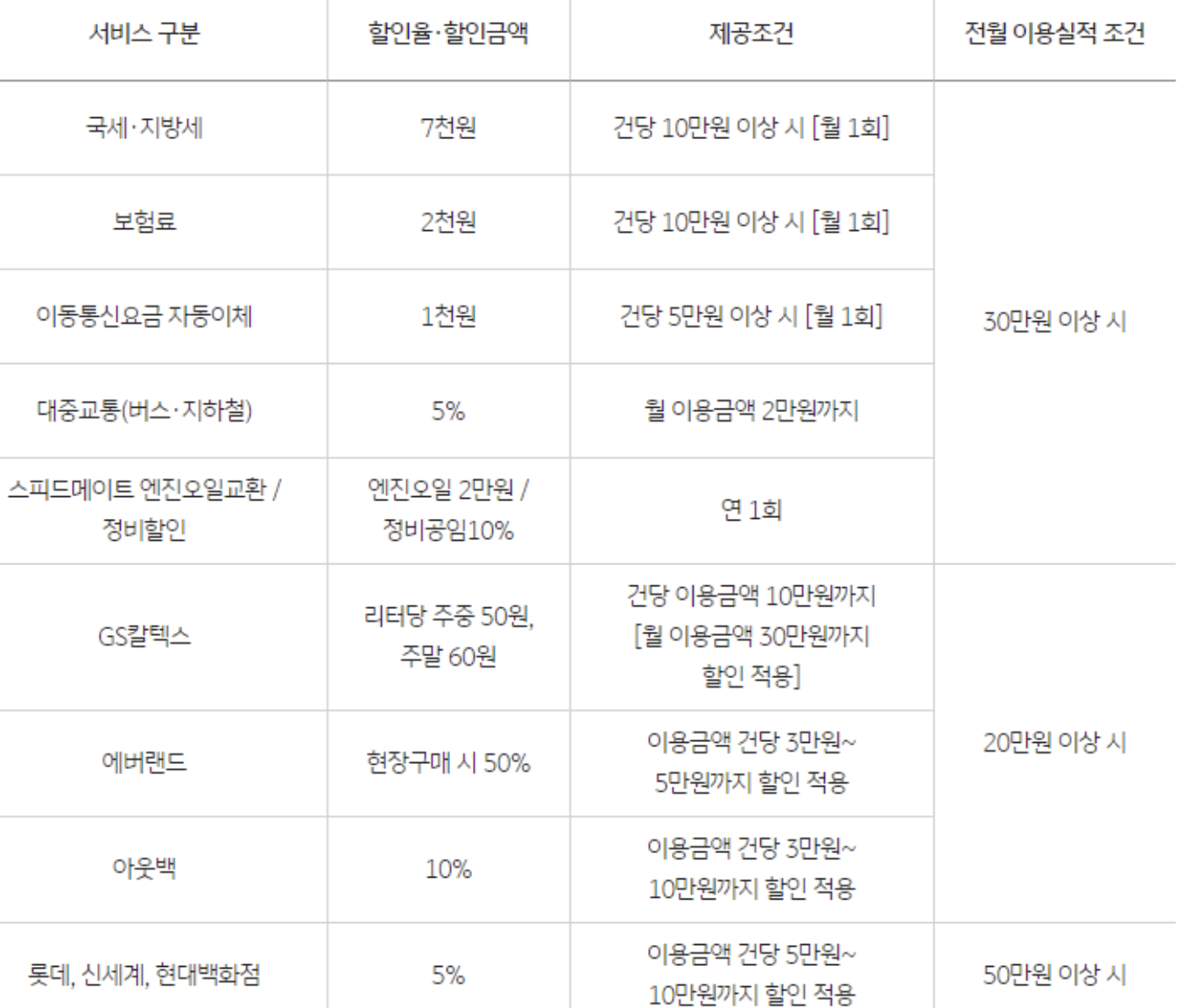 전월 이용실적이 30만원 이상이면 국세, 지방세 건당 10만 원 이상시 7천 원 환급할인을 해줍니다.
