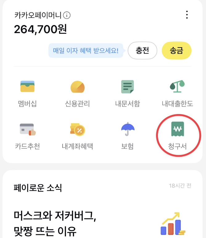 위와 같이 청구서 메뉴를 통해서 청구된 내용을 확인하고 카카오페이로 바로 납부할 수 있습니다.
