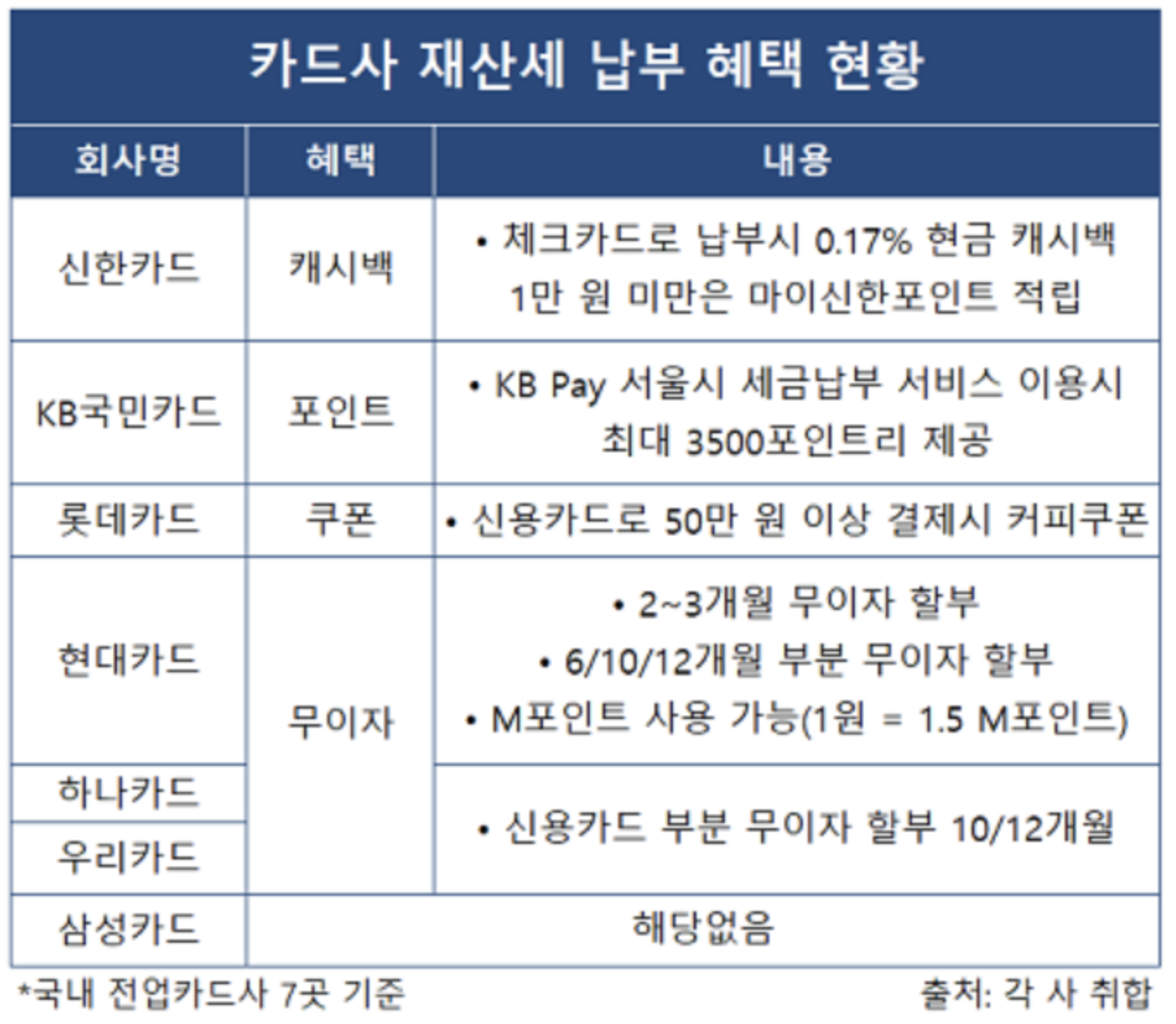 재산세를 무이자 카드 할부로 낼 수도 있고 스타벅스 쿠폰을 무료로 주는 이벤트를 알아보겠습니다. 이번 재산세는 7월 말까지 납부해야 하는데 보통 카드사에서 재산세를 내면 혜택을 제공합니다. 이 혜택이 보통 7월 15일은 지나야 여러 곳에서 나옵니다. 그래서 재산세를 빨리 납부하기보다는 좀 기다렸다가 이벤트를 많이 하는 곳에서 납부하는 것이 좋습니다.