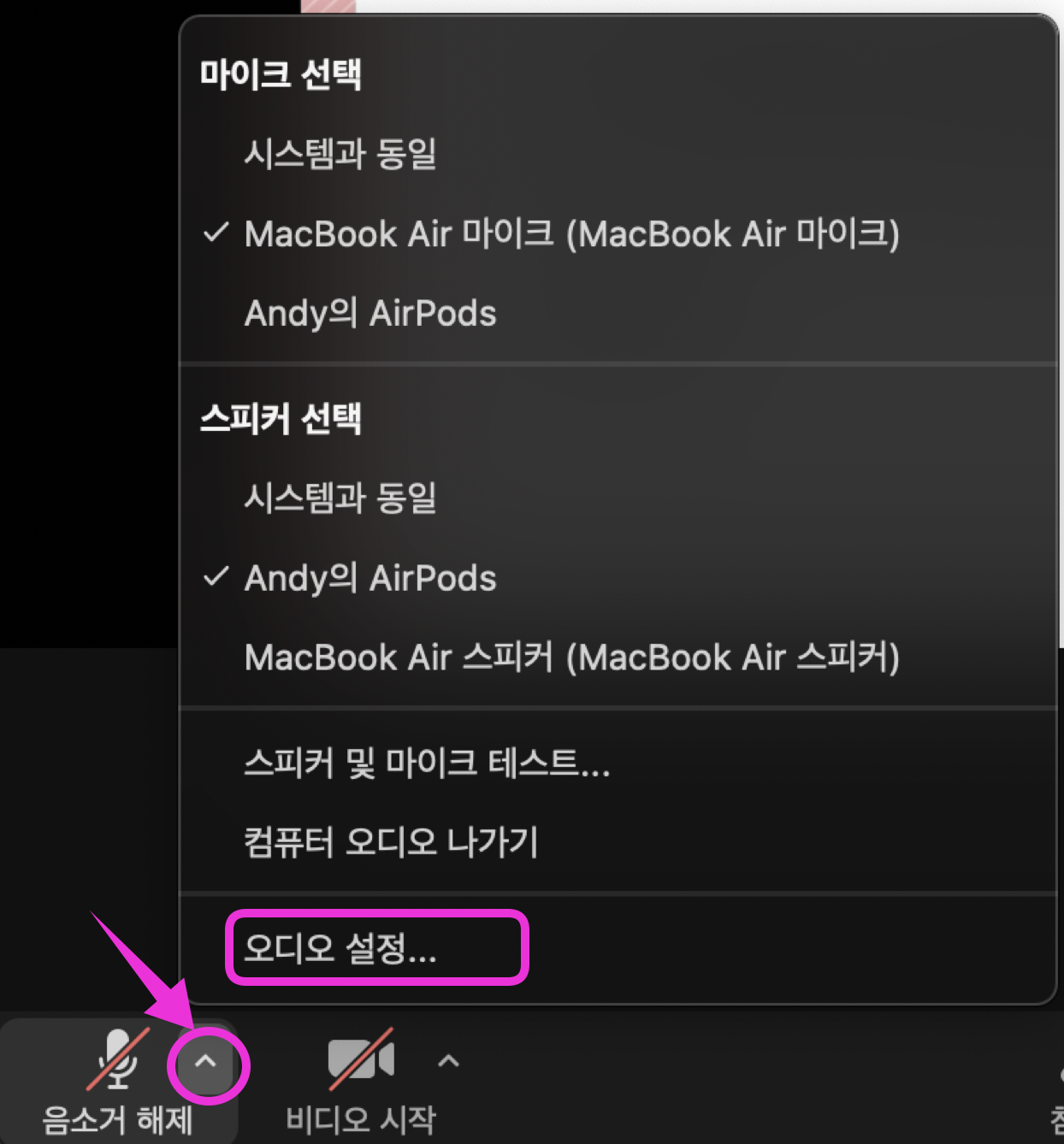 줌 화상회의 화면의 하단에 <오디오 시작> 옆에 화살표 부분을 클릭하면 여러가지 선택창이 나옵니다.
