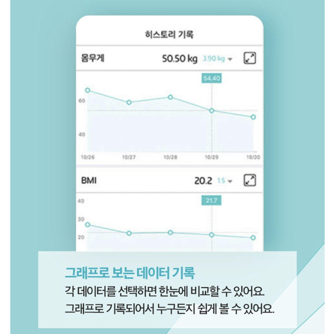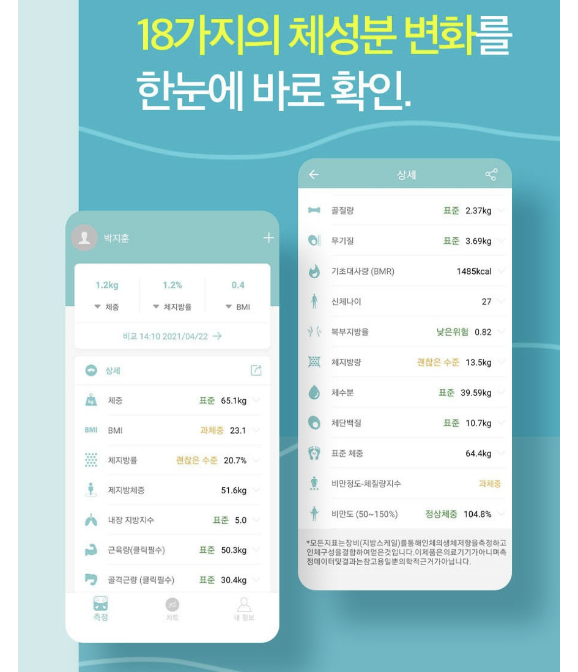 체중 뿐만 아니라 체지방지수, 체내수분량, 골격근량, 기초대사량 등 건강검진시에 측정하는 종목에 대해서 알려준다.
