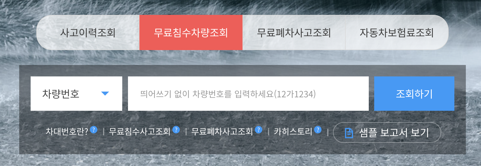 위의 페이지에 접속해서 <무료침수차량조회>를 클릭하고, 차량번호만 넣으면 조회가 가능합니다.
