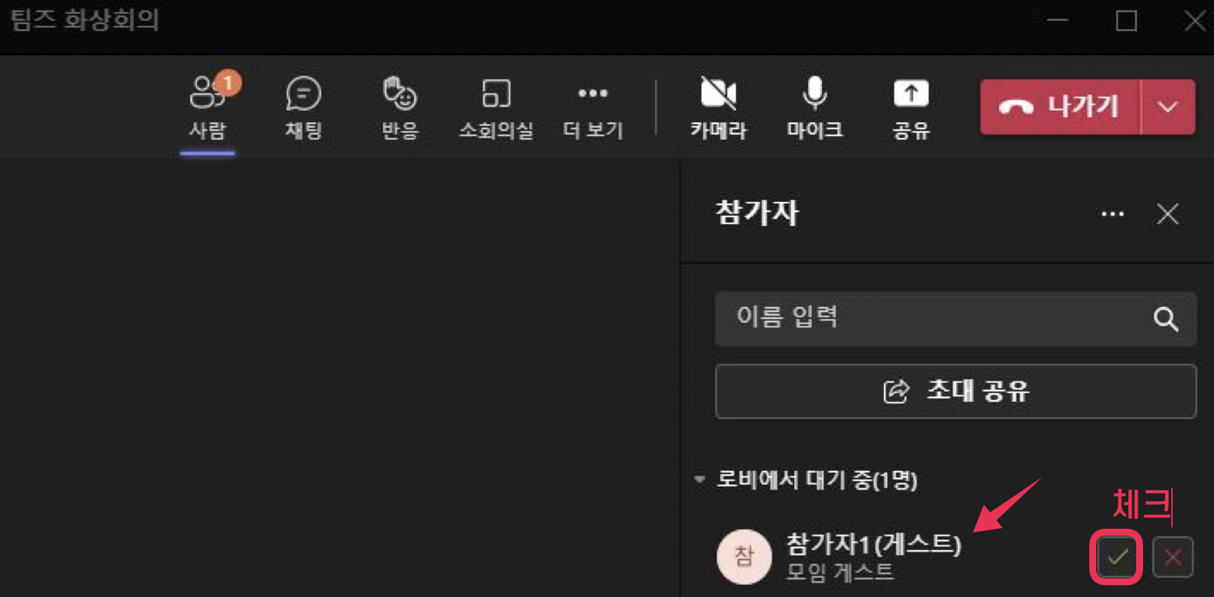 화상회의 방을 만들면 처음 만든 사람이 참석자의 입장 여부를 승인해주어야 한다.
