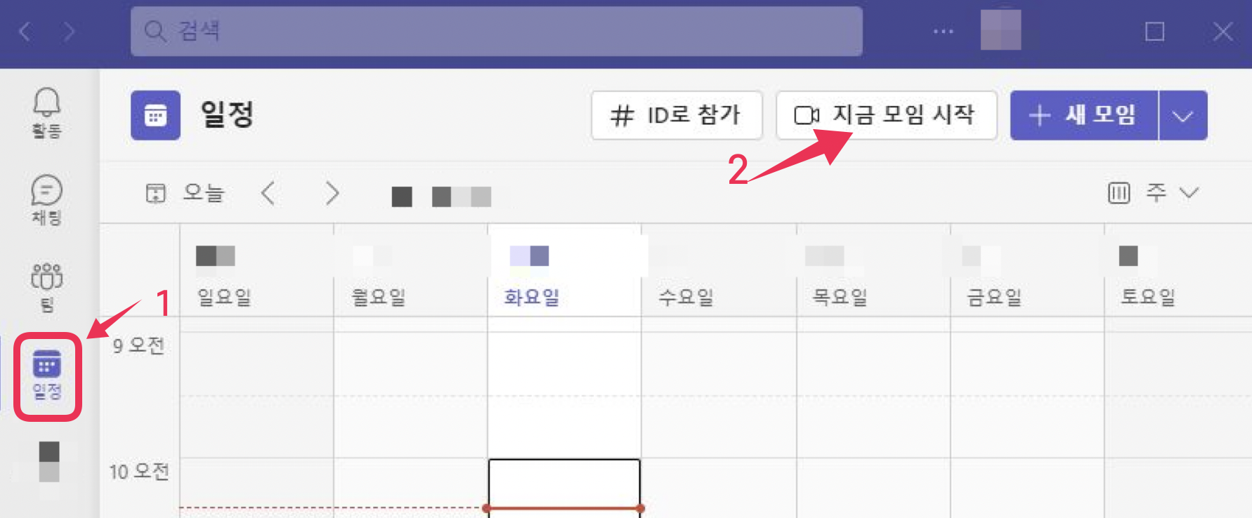 팀즈에 로그인을 하고, 일정 탭을 클릭한다.