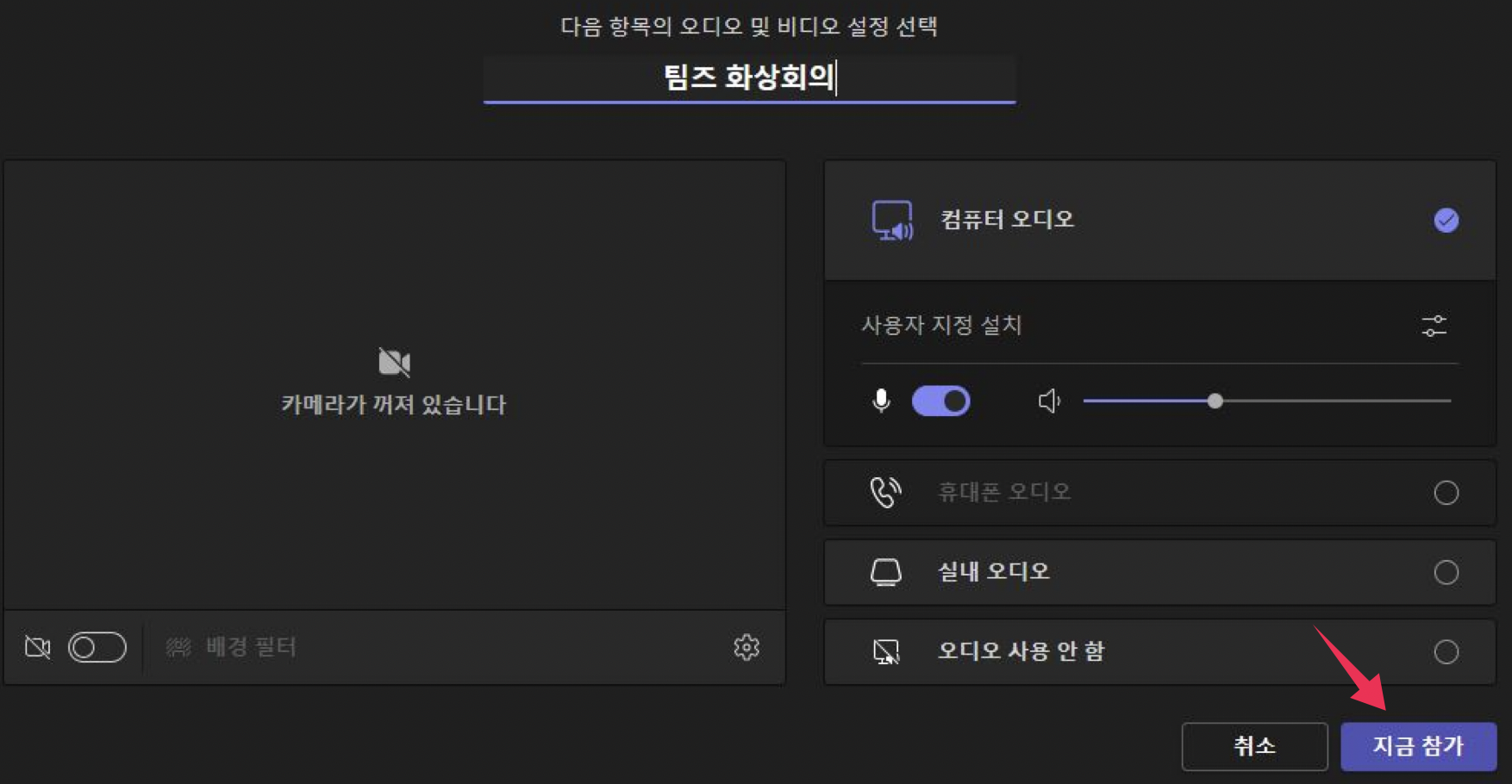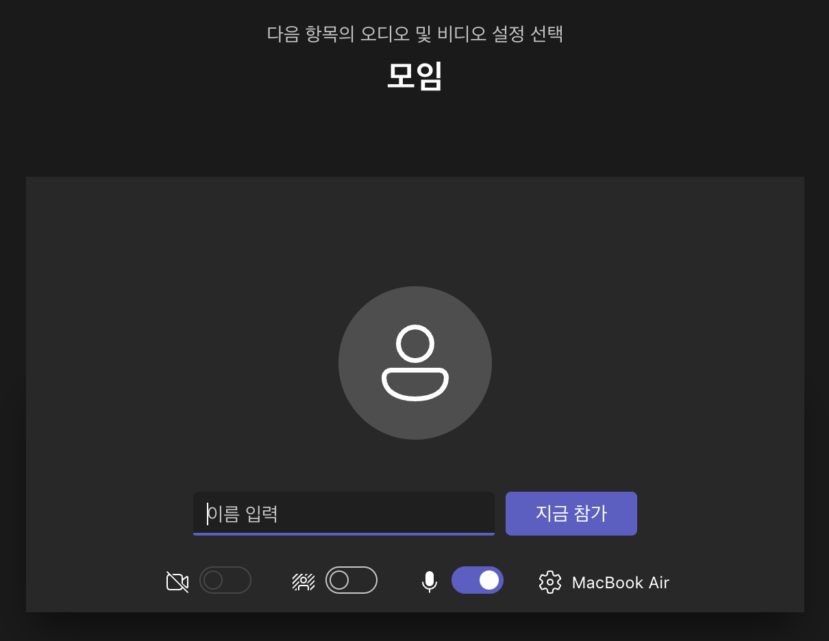 위와 같이 화상회의 대화방을 만들고 <지금 참가>를 누르면 아래 화면이 나온다.