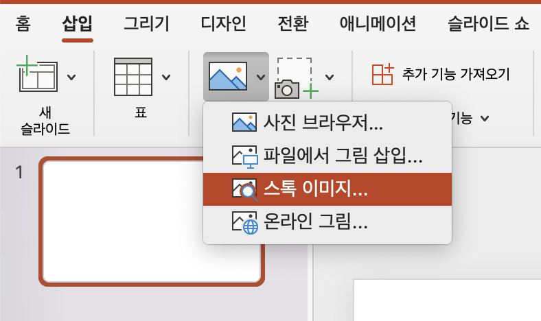 먼저 사진을 준비하여 슬라이드에 꽉 차게 배치해줍니다. 본인이 가지고 있는 좋은 화질의 사진을 하나 가져옵니다. 만약 연습용으로 해보는 것이라면 파워포인트에서 제공하는 스톡 이미지를 사용하면 품질 좋은 사진을 검색할 수 있습니다.