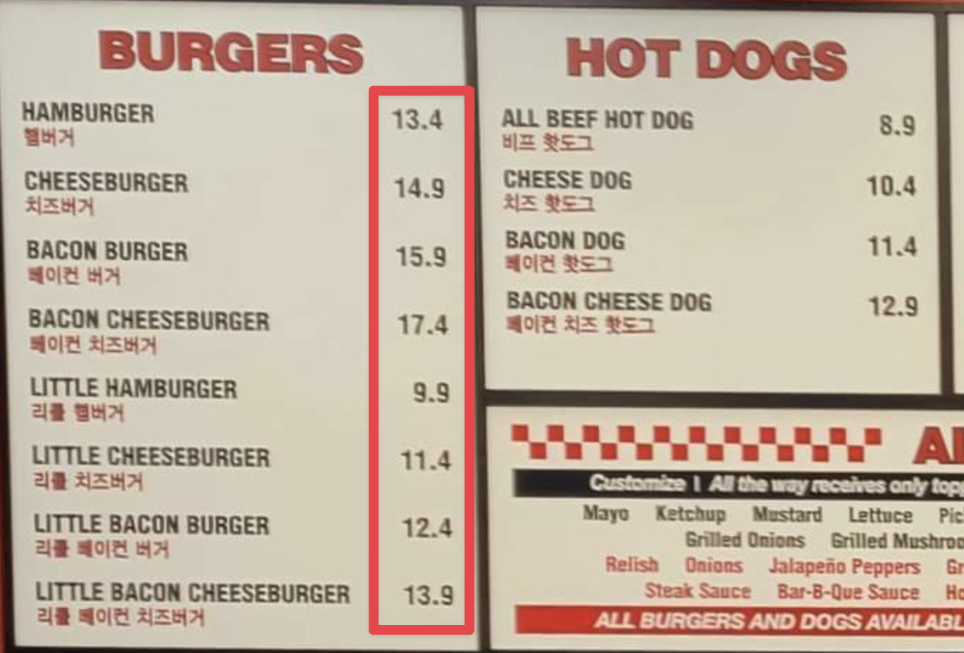 먼저 가격표 부터 보겠습니다. 기본 햄버거(패티 2장) 1만3천4백원입니다. 리틀 햄버거(패티1장) 9천9백원입니다. 가격이 일단 후덜덜하지요. 한번쯤은 가격때문에라도 먹어보고 싶은 생각 들지 않나요?