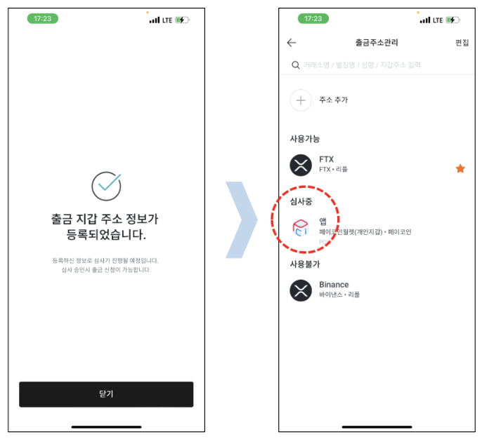 증빙자료를 모두 제출하면 "출금 지갑 주소 정보가 등록되었습니다"라는 문구가 나오고, 닫기를 누르면 심사 중인 지갑 주소로 나오게 됩니다.