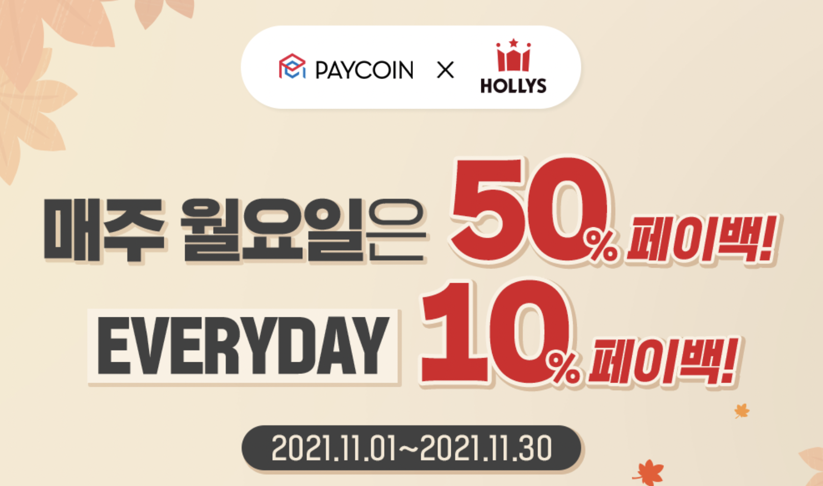 이디야 역시 매주 월요일 50% 페이백, 나머지 10% 페이백을 진행합니다.