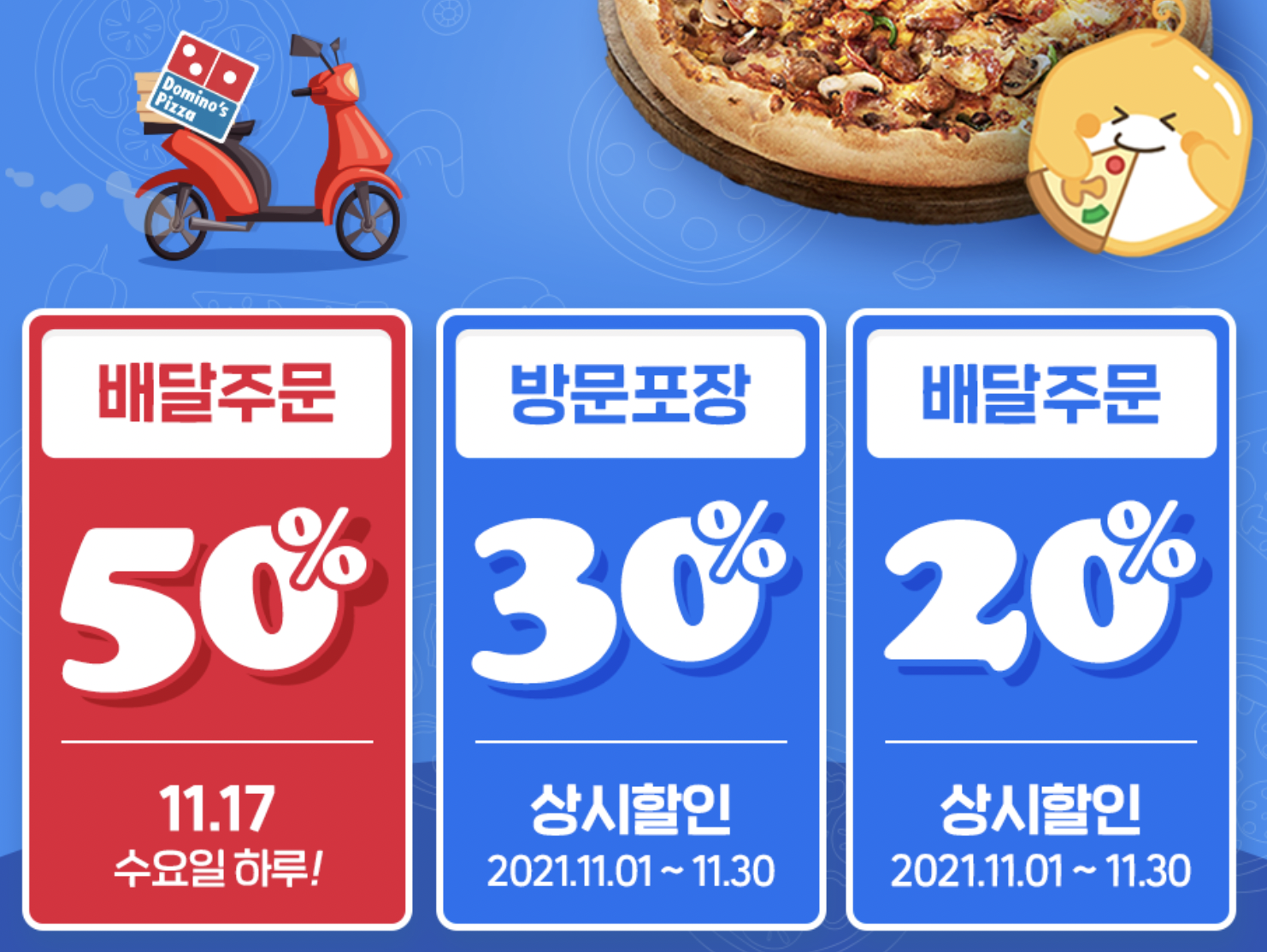 이 밖에도 도미노 특정일 피자 배달 주문 50%, 평상시에는 방문 포장 30%, 배달주문 20%를 할인 해 줍니다.
